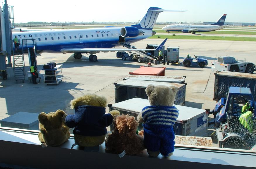 We left Chicago on a airliner bound for Calgary in Canada. Here we are waiting at the gate. McBear managed to sneak in that it was a CRJ700 from United Express.