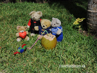 McBear pushed the two straws together tight. Then, we had the perfect smoothie bar! Even Goye could enjoy fresh juice from the nut on the spot!